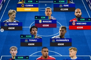 中場(chǎng):戈登(紐卡,6500萬歐)、托納利(紐卡,6000萬歐)、羅杰斯(維拉,5500萬歐)、吉馬良斯(紐卡,8000萬歐)