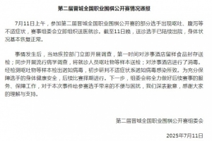 7月11日上午,參加第二屆晉城全國職業(yè)圍棋公開賽的部分選手出現(xiàn)嘔吐、腹瀉等不適癥狀,賽事組委會立即組織送醫(yī)就診。截至11日晚,送診選手已陸續(xù)出院,身體狀況基本恢復正常。