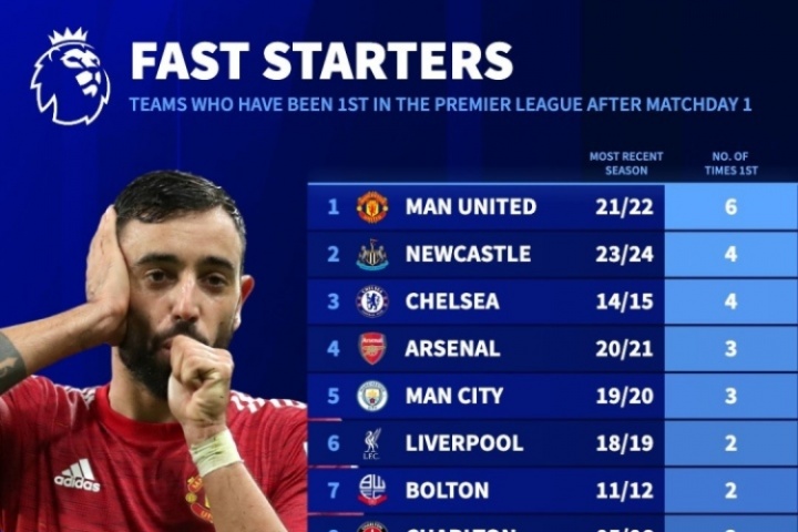體育資訊08月15日訊 新賽季英超開賽在即,德轉(zhuǎn)列出了哪些球隊在英超第一輪后占據(jù)榜首的次數(shù)最多,曼聯(lián)以6次排名第一。