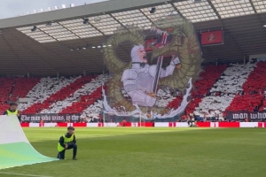 體育資訊8月16日訊 桑德蘭回歸英超后迎來首戰(zhàn),與西漢姆的比賽正在進行當(dāng)中,黑貓球迷們打出巨幅TIFO,給球隊打氣。