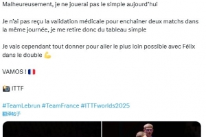 大勒布倫在世乒賽開始之前右手受傷,法國(guó)乒協(xié)表示大勒布倫退出單打比賽這一決定是為了球員更好地專注雙打比賽。