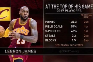 這是詹姆斯17年季后賽前七場的場均數(shù)據(jù),騎士7勝0負(fù)。