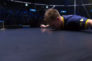 賽后,莫雷加德親吻球臺慶祝這個來之不易的冠軍。