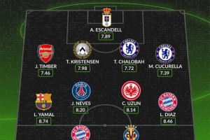 中場:亞馬爾(巴薩,8.74分)、若奧-內(nèi)維斯(巴黎,8.20分)、詹-烏尊(法蘭克福,8.14分)、路易斯-迪亞斯(拜仁,8.46分)