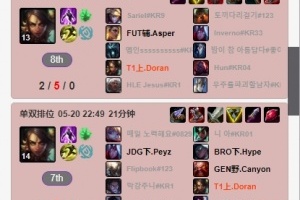 體育資訊5月22日訊 根據(jù)韓服排位統(tǒng)計小程序顯示,T1上單Doran近日在韓服排位中連續(xù)玩了數(shù)把上單豹女,但是戰(zhàn)績欠佳!